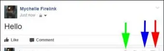 - Si vous souhaitez publier un GIF ou un autocollant en tant que commentaire, le menu de ces options apparaît à droite de la zone de texte du commentaire. L'option emoji est l'icône du visage souriant (flèche verte dans l'image ci-dessous), l'option GIF est la petite icône GIF carrée (flèche bleue) et l'option autocollant est le visage souriant carré (flèche rouge).