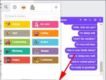 - Pour insérer un autocollant, appuyez sur l'icône smiley carrée (flèche rouge dans l'image ci-dessous) qui fera apparaître le menu des autocollants. Vous pouvez cliquer sur l'émotion que vous souhaitez rechercher.