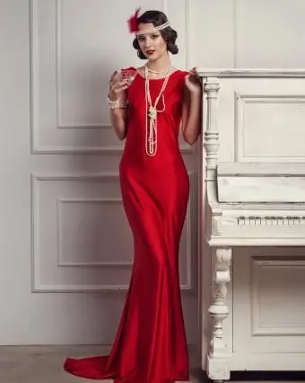 Outre les robes au-dessus du genou, au genou et au-dessous du genou, les robes longues étaient également populaires. Les balais traditionnels rappelant l'époque étaient portés pour les bals et les occasions formelles. Du rouge remarquable au nude minimaliste, ces robes longues étaient souvent associées à des bijoux en perles et à des bandeaux. Associez une robe longue au sol sans manches comme celle-ci avec des colliers et des bracelets en fausses perles superposés. Vous pouvez également utiliser un collier de perles comme serre-tête : enroulez-le autour et épinglez-le dans vos cheveux une fois que vous avez terminé de vous coiffer (ajoutez une plume sur le côté pour cette ambiance des années 20).