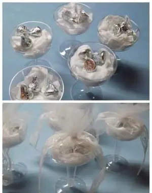 - Des verres en plastique de taille standard ont été utilisés pour la faveur du verre à champagne, mais des verres à champagne miniatures peuvent être utilisés avec des cercles de tulle de 9 pi. Les flûtes en plastique et les verres à vin sont également des alternatives amusantes au verre à champagne standard.