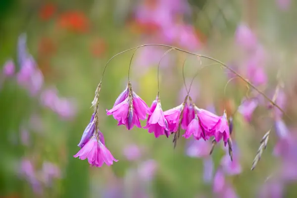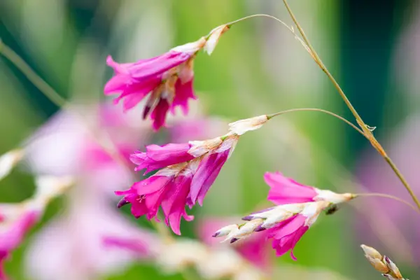 Les diéramas sont de belles vivaces herbacées qui sont également connues sous le nom de cannes à pêche ou de baguettes d'Angel, grâce à leurs tiges délicates et arquées. Ceux-ci émergent du feuillage à feuilles persistantes ou semi-evergeen en été en été et portent la tête, des fleurs en forme de cloche dans des tons de rose, mais aussi violet, bordeaux, rouges ou blancs.