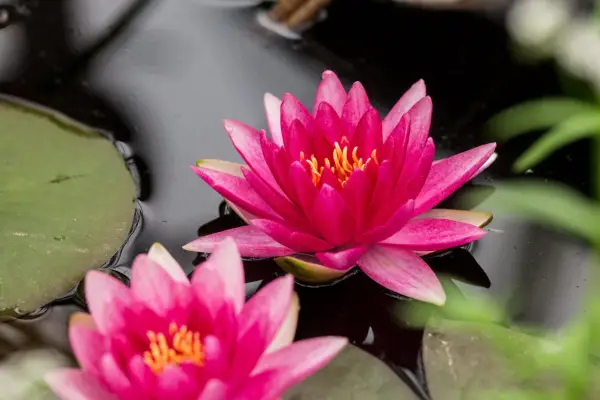 Nymphaea 'Rembrandt' porte des fleurs roses semi-doubles de juin à septembre, sur des feuilles-vert rouge. Les feuilles fournissent un pavé d'atterrissage aux abeilles assoiffées, tout en offrant un abri pour la faune aquatique sous la surface. La teinte coulée des feuilles aide également à prévenir la croissance des algues.