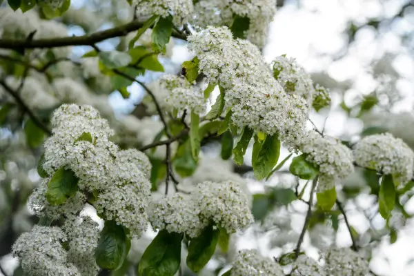 La baie de Noël, Photinia Beauverdiana, est un arbuste à feuilles caduques originaire des montagnes, des rivières et des bois de Chine, du Nord-Vietnam et du Bhoutan. Il a grandi principalement pour sa couleur d'automne et d'hiver - en automne, ses feuilles deviennent une teinte d'orange fantastique avant de tomber, tandis que ses baies rouge voyantes restent longtemps en hiver et sont particulièrement proéminentes à Noël. Ce n'est pas sans sa beauté au printemps et en été; Ses feuilles émergent du brun violet, mûrissant au vert foncé, qui sont magnifiquement complétés par des masses de minuscules fleurs blanches en forme de tasse au début de l'été.